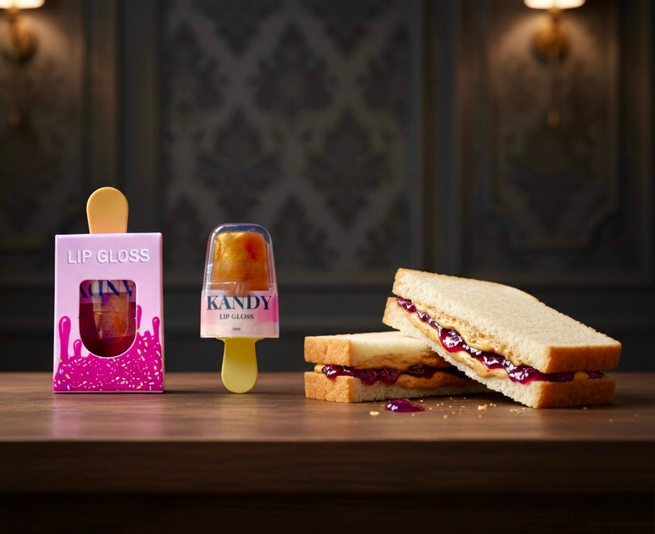 Indulge your lips with this delightful organic peanut butter and jelly scented lip gloss, expertly formulated with natural ingredients for a nourishing application. The playful popsicle-shaped container makes application effortless while adding a charming touch to your beauty collection. Each purchase arrives in an elegantly designed package box, perfect for gifting or personal enjoyment. Experience the perfect blend of nostalgic flavor and lip care in one whimsical product.